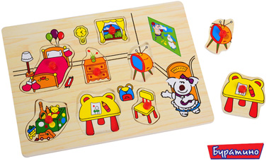 Игрушки, сделанные из натурального экологически чистого материала – дерева. Рамка представляет собой дощечку с вырезанными в ней фигурками. В каждое отверстие вставлена соответствующая фигурка - вкладыш.