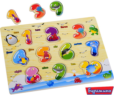 На деревянном планшете расположены деревянные вкладыши с изображением цифр от 0 до 9 с морскими животными, каждой цифре соответствует название на английском языке «one» - один, «two» - два, «three» - три и т.д. В игровой форме ребенок легко обучится цифрам и счету на английском языке.