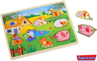 На деревянном планшете изображен деревенский дворик с русской избой, расположены пазлы-вкладыши в виде домашних животных. Пазлы музыкальные, когда ребенок поднимает вкладыш, а затем кладет его на место – поросенка, туда, где изображен поросенок, собаку, туда, где изображена собака, то при каждом правильном действии малыша происходит музыкальное сопровождение, животные издают звуки: корова – мычание, собака – лай и т.д.