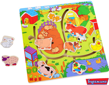 Лабиринт "Домашние животные", изготовленный из дерева, учит ребенка ассоциативному мышлению. Игра состоит из игрового поля, фонового рисунка с изображением места жительства домашних животных, и фигурок животных. Фигурки закрепляются на специальных держателях, малыш должен провести в места их обитания, с луга по своим домикам, придумывая различные сценарии для игры.