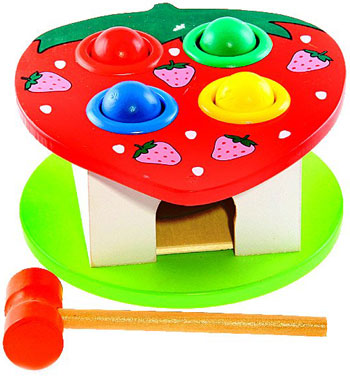 Данная игрушка стучалка "Клубника" состоит из деревянной коробочки, сверху находится яркий планшет в форме клубники. В нем четыре лунки, в них вкладываются шарики четырех основных цветов: желтый, красный, зеленый и синий. Деревянные шарики удерживаются пластмассовыми кольцами, вклеенными в отверстия деревянной основы. Кладем шарики в отверстие, соответствующее цвету шарика и стучим по нему молоточком. Шарики с грохотом скатываются наружу. СТУЧАЛКА - незаменимая игра для гиперактивных детей: снижает избыточную активность, напряжение, помогает снять агрессивность.Малыш с удовольствием будет стучать по ярким шарикам, одновременно развивая ловкость, координацию движений, моторику, глазомер, внимательность,