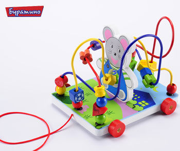 На основании лабиринта прикреплены цветные проволочки. На каждую проволоку нанизаны маленькие цветные фигурки из дерева, которые можно передвигать. Лабиринт на колесах, легко передвигается при помощи веревки. В процессе игры развиваются крупная и мелкая моторика рук и пальчиков, улучшается зрительное и моторное восприятие предметов в пространстве. Игру можно применять как пособие для обучения малыша порядковому и количественному счету, а также для изучения основных цветов. Игра вырабатывает ловкость рук, сноровку и координацию движений, развивает мелкую моторику пальцев рук, а так же стимулирует развитие умственных способностей у детей.
