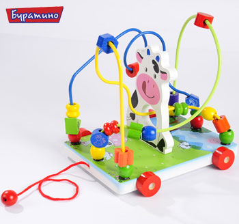 На основании лабиринта прикреплены цветные проволочки. На каждую проволоку нанизаны маленькие цветные фигурки из дерева, которые можно передвигать. Лабиринт на колесах, легко передвигается при помощи веревки. В процессе игры развиваются крупная и мелкая моторика рук и пальчиков, улучшается зрительное и моторное восприятие предметов в пространстве. Игру можно применять как пособие для обучения малыша порядковому и количественному счету, а также для изучения основных цветов. Игра вырабатывает ловкость рук, сноровку и координацию движений, развивает мелкую моторику пальцев рук, а так же стимулирует развитие умственных способностей у детей.