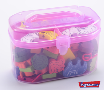 Б 503 Сборные бусы 70 деталей - это набор крупных деталей разной формы и цвета, уложенный в пластиковый чемоданчик. В комплект также входят два длинных шнурка с деревянными наконечниками, облегчающими процесс вдевания.
