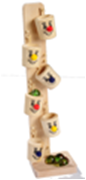 Эта деревянная игрушка состоит из шести ведрышек прикрепленных к вертикальному основанию. В самое верхнее ведрышко кладется шарик и он сам из первого ведрышка попадает в следующее и так добирается до последнего.