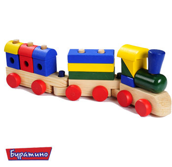 Многофункциональная деревянная игрушка для малышей. Это одновременно и конструктор, и пирамидка, и разноцветный поезд. Конструктор-поезд представляет собой три соединяющиеся деревянные платформы на колесиках с вертикальными стержнями. На стержни нанизываем остальные детали. Все детали разных цветов, форм и размеров. В каждой – круглые отверстия для нанизывания на стержни. Собранный поезд ездит и достаточно крепок для игры.