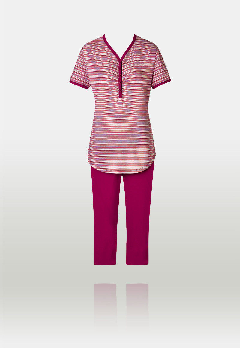 Женская пижамка с коротким рукавом и штанами 34 доступна в серии Las**ting Sum***mer.Сделана из деликатного и очень приятного хлопка.Сорочка в двухцветную полоску свободного кроя.Рукава с манжетами,V-образное декольте на пуговичках.Штаны гладкие,прямые, в однотонном цвете.Очень удобный фасон,идеальный для тёплых дней!