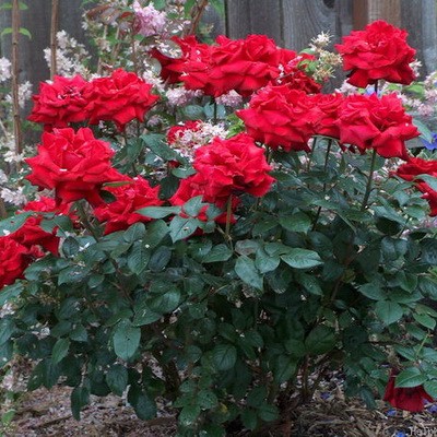 Куст сильнорослый 120 см высотой, с блестящей листвой. Цветки густомахровые (45 лепестков), диаметром 10 см, с приятным ароматом. Лепестки глубокого красного цвета, бархатистые. Прекрасно переносят дождь.