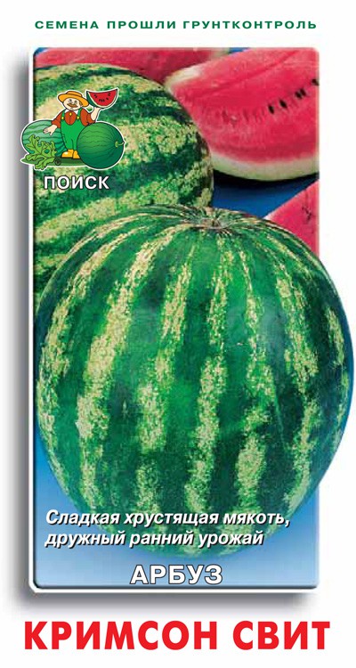 Самый распространённый раннеспелый сорт. Период от полных всходов до первого сбора плодов 67-82 дня. Растение плетистое. Лист среднего размера, зеленый, рассеченный. Плод округлый, гладкий, светло-зеленый до зеленого с зелеными полосами средней ширины. Масса плода 4-5 кг (до 10-12 кг). Мякоть красная, хрустящая и очень сладкая. Вкус отличный. Отличается дружной отдачей раннего урожая. Сорт устойчив к антракнозу. Транспортабельный.