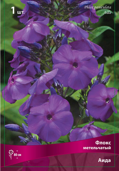 Аида - высота растения 80см, цветок темно-фиолетовый. Не выгорает. Диаметр цветка 4 см. Соцветие пирамидальное, средней плотности. Начало цветения в середине июля. Аромат сильный, очень приятный. Куст компактный, стебли прочные. Высота растения 60-65 см. Среднеустойчив к грибным болезням.
