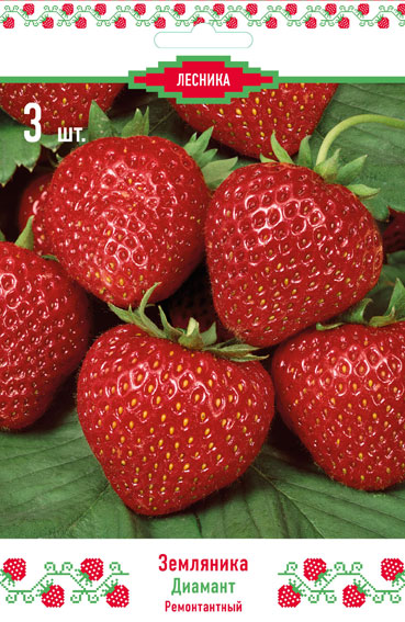 Ремонтантный. Американский сорт, созданный в Калифорнийском университете. Производительность ягод большая, является лучшим по вкусовым качествам среди ремонтантных сортов, созданных до последнего времени. Плодоношение стабильное, урожай убирается легко. Цвет мякоти светлый, поэтому ягоды для переработки используются мало. Диамант склонен к усообразованию в период плодоношения. Сорт устойчив к паутинному клещу и милдью.