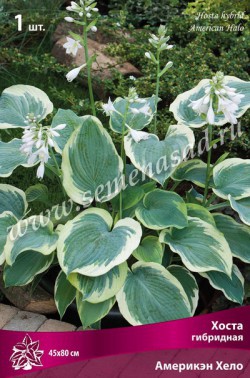 Америкэн Хело - высота куста 45см, ширина 80см, листья сердцевидные, темно-зелено-голубые с неровной каймой от желтого до цвета слоновой кости, цветки белые.