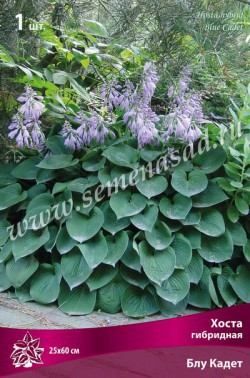 Блу Кадет - высота куста 25см, ширина до 60см, листья сердцевидные, плотные, зеленовато-голубые, цветки лиловые. Цветение июль-август.