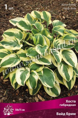 Вайд Брим- высота куста 50см, ширина 75см, листья сердцевидные, плотные, морщинистые, ярко-зеленые с неровной желтой полосой по краю, которая затем становится кремово-белой, цветки лиловые. Крупная. Цветение июль-август.