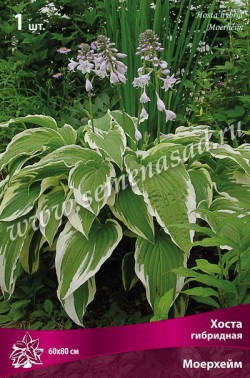Моерхейм - высота куста 60см, ширина 80см, листья сердцевидные, слегка морщинистые, светло-зеленые с неровной кремово-белой каймой, цветки сиреневые.