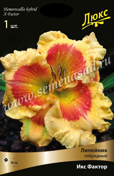 Икс Фактор - высота растения 30см, желтый с красным глазком и зеленым горлом, крупный, гофрированный, повторное цветение. Цветение июль-август.