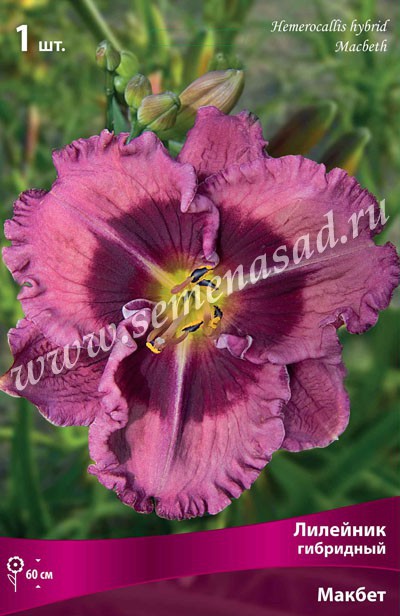 Макбет - высота растения 60см, цветок сиренево-лавандовый с пурпурным глазком и каймой, крупный, гофрированный. Цветение июнь-июль.