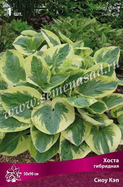 Сноу Кэп - высота куста 50см, ширина 90см, листья сизовато-голубые с широкой неравномерной кремово-белой каймой, цветки бледно-лавандовые.