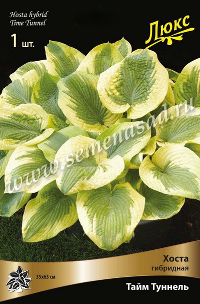 Тайм Туннель - высота куста 35см, ширина 65см, листья сердцевидные, зелено-голубые с с широкой желтой каймой.