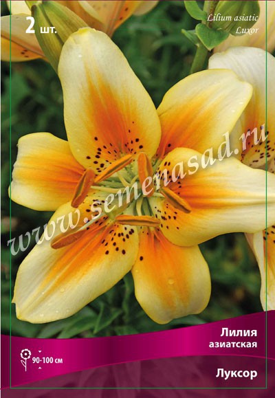 Луксор - высота растения 90-100см, цветок кремово-желтый со светло-оранжевой серединой и коричневым крапом в горле.
