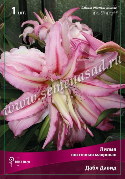 Дабл Давид- высота растения 100-110см, цветок розовый, с тёмно-розовой полосой вдоль лепестка и редким крапом.