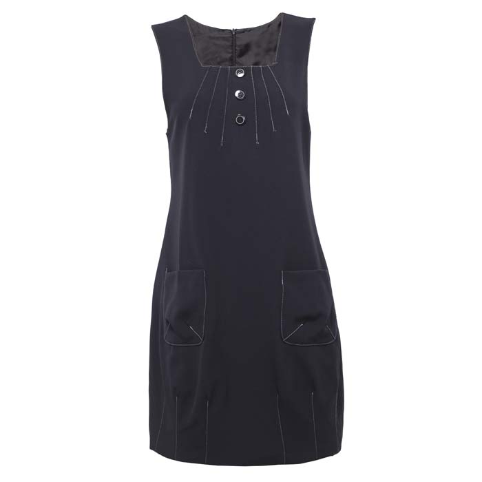 Сарафан для девочки из текстиля тёмно-синего цвета. Свободный силуэт. Вырез горловины полочк "каре". По горловине вытачки. Накладные боковые карманы. По низу застрочены вытачки. На спинке талевые вытачки