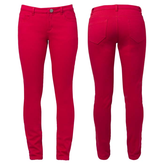Джинсы для девочки красного цвета. Утеплённые. Силуэт SLIM. На передних половинках боковые карманы и часовой. На задних половинках кокетки и два накладных кармана. В пояс проложена резинка.