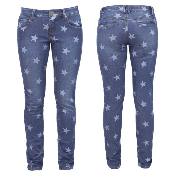 Джинсы для девочки синего цвета. Утеплённые. Силуэт REGULAR. На передних половинках боковые карманы и часовой. На задних половинках кокетки и два прорезных кармана с листочкой. В пояс проложена резинка. На джинсах принт "звёзды"