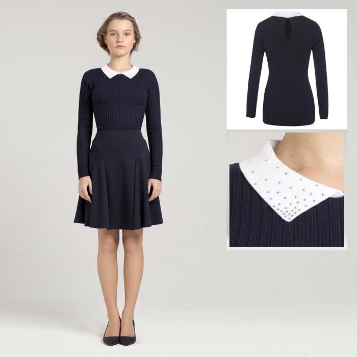 Блуза для девочки из вязанного трикотажа темно-синего цвета. Длина стандартная. Силуэт SLIM. Воротник из вязанного трикотажа белого цвета с застежкой сзади на пуговицу. Длинный рукав.
