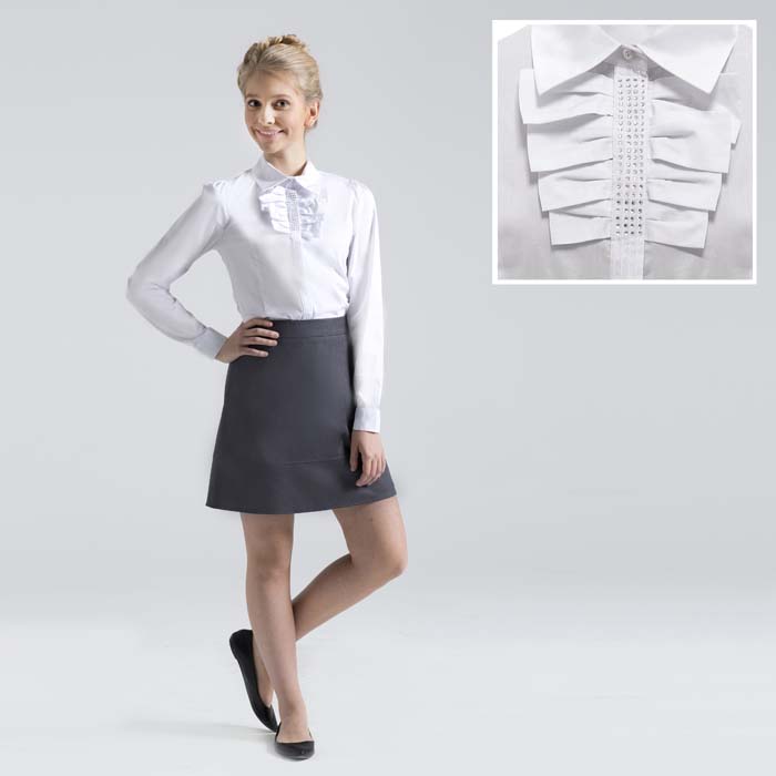 Батник для девочки из текстиля белого цвета. Приталенного силуэта. Длинный рукав. По окату рукава заложены складки. Рубашечный воротник. Супатная застёжка полочек на пуговицы. На полочке по планке бантики. На полочке и спинке рельефы. Рукава с манжетами и застёжкой на пуговицы
