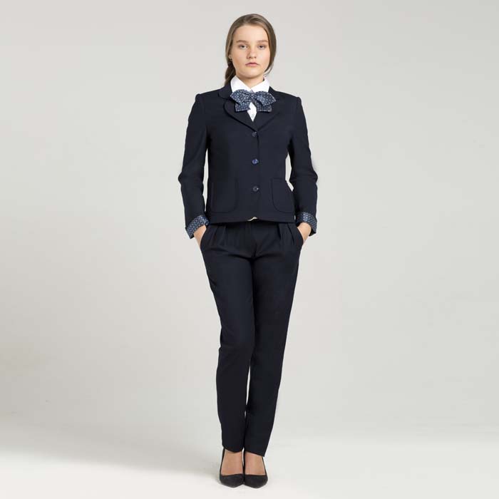 Жакет для девочки из текстиля темно-синего. цвета.Длина стандартная.Силуэт полуприлегающий.Отложной воротник с лацканами.На ПП два накладных кармана.Застежка на пуговицы.На подкладке.Низ рукава внутрення сторона выполнена из отделочной ткани с рисунком.