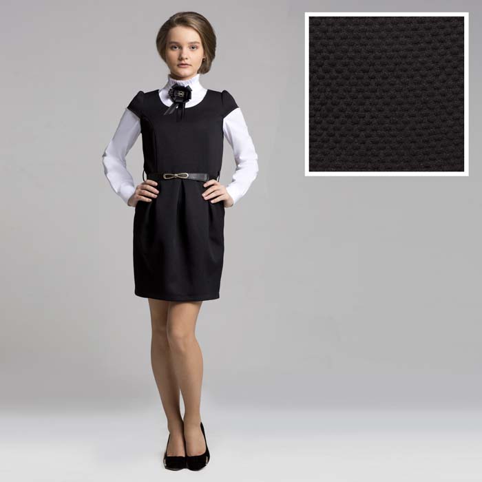 Сарафан для девочки из текстиля черного цвета с обьемным рисунком.Длина плюс 7см до линии колена.Силуэт полуприлегающий+расширенный.Застежка сзади на молнии.