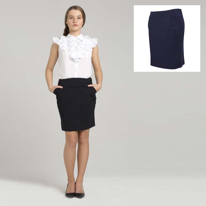 Юбка для девочки из текстиля тёмно-синего цвета, на подкладке. На передней половинке карманы и складки. В пояс проложена резинка. На задних половинках застёжка молния и разрез