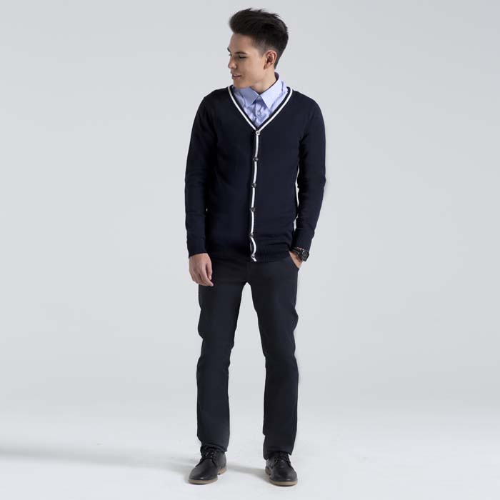 Жакет для мальчика из вязанного трикотажа тёмно-синего цвета. "У" образный вырез горловины. Длинный рукав. Застёжка полочки на пуговицы. По борту и горловине провязана полоска контрасного цвета
