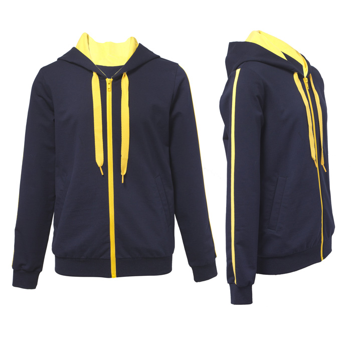 Жакет-толстовка для девочки из трикотажного футора т.синего цвета . Длинный рукав на притачном манжете. Жакет на молнии. На полочке прорезные карманы с листочкой. Жакет с капюшоном. В капюшон продет шнур. Притачной пояс по низу жакета