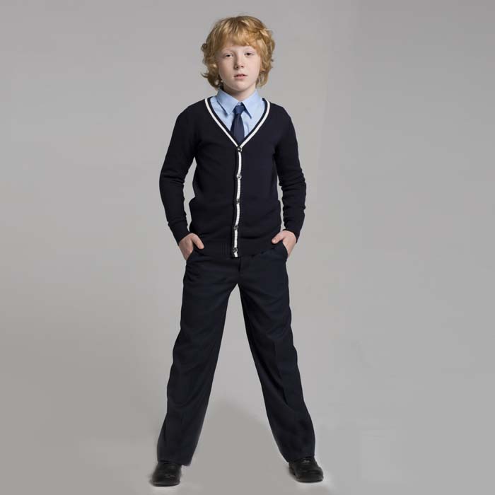 Жакет для мальчика из вязанного трикотажа тёмно-синего цвета. "У" образный вырез горловины. Длинный рукав. Застёжка полочки на пуговицы. По борту и горловине провязана полоска контрасного цвета