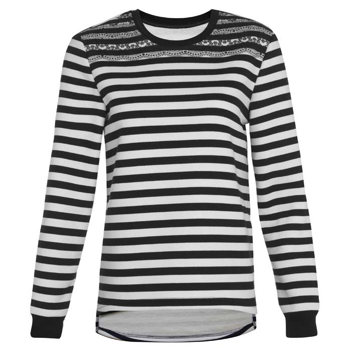 Джемпер для девочки из утеплённого футера чёрного цвета в белую полоску. Силуэт прямой. Длина до подъягодичной складки. Вышивка на полочке с деталями из искусственной кожи чёрного цвета. По бокам разрезы.