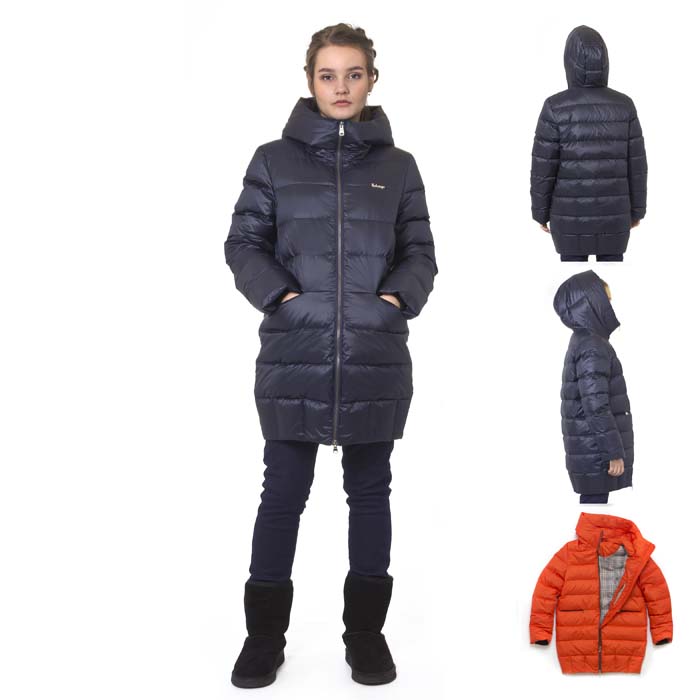 Пальто для девочки на зиму из плащёвки тёмно-синего цвета, с водоотталкивающей пропиткой, утеплённое на пуху. Подкладка текстильная. Пальто длиной до линии середины бедра, прямого силуэта. Манжет рукавов из вязанного трикотажа. С капюшоном, переходящем в воротник. По капюшону продета шляпная резинка с фиксаторами. Застёжка полочек на молнию с двумя слайдерами, с внутренним ветрозащитным планкой-пластроном. На полочке два внутренних боковых кармана на молнии. На левой полочке внутренней части потайной карман на молнии. На полочке металлическая нашивка SABOTAGE