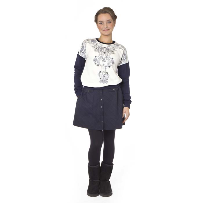 Юбка для девочки из текстиля в синюю/чёрную крупную клетку. Силуэт расширенный. Посадка стандартная. Длина выше колена на 9-10см. Притачной пояс-кокетка. Юбка застёгивается на пуговицы на передней половинке. По шву притачивания кокетки клапана. Юбка на подкладке