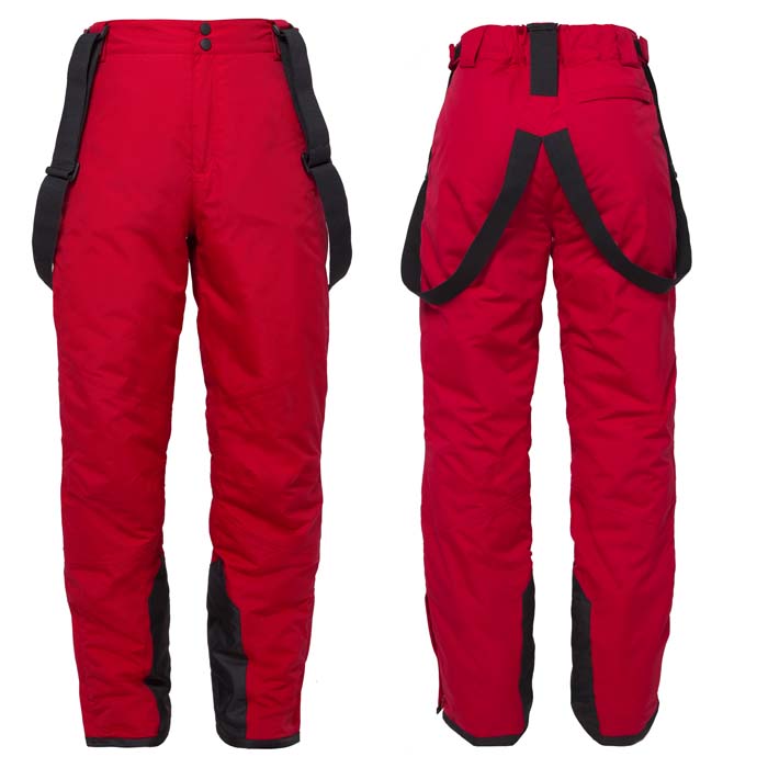Брюки для мальчика из курточного текстиля с водоотталкивающей пропиткой, красного цвета, на подкладке. Утеплённые на холофайбере плотностью 100г/м2. Прямого силуэта. На передних половинках боковые карманы на молнии. В области колена вытачки. На задней половинке карман с листочкой на молнии. Брюки с подтяжками. По низу боковых швов молнии и вставки контрастного цвета. По низу брюк пришита дополнительная деталь с резинкой для ботинок