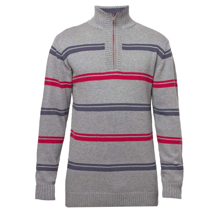 Джемпер для мальчика из вязанного трикотажа цвета серый меланж с красной полоской. Прямой силуэт. Длинный рукав на манжете. Воротник стойка. Застёжка на полочке на молнию.