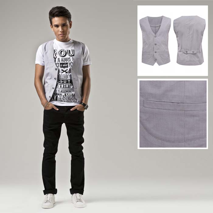 Жилет для мальчика из текстиля серого цвета. Силуэт REGULAR. Длина стандартная. Текстильная подкладка. На спинке регулируемый хлястик на пуговицах. Застёжка на пуговицы