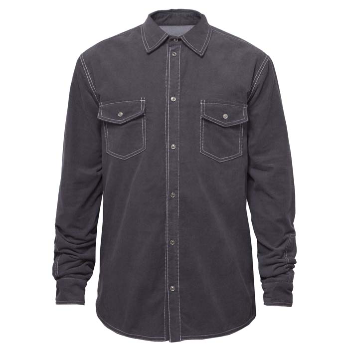 Рубашка для мальчика из вельвета в тонкий рубчик, тёмно-серого цвета, на подкладке из флиса. Прямой силуэт. Длинный рукав на манжете. Рубашечный воротник. На полочке два накладных кармана с клапаном. Рубашка застёгивается на пуговицы.
