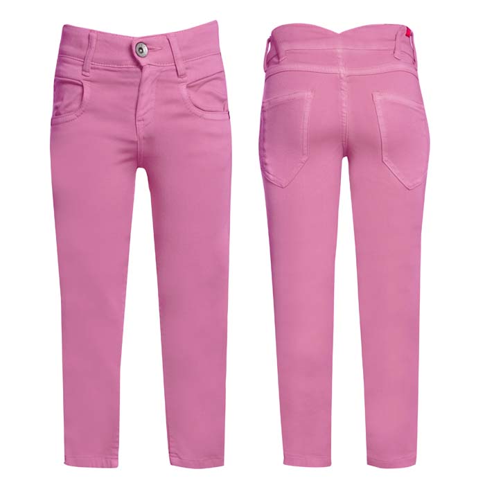 Брюки для девочки из текстиля розового цвета. На передних половинках боковые карманы. На задних половинках кокетки и два накладных кармана.