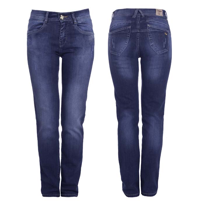 Джинсы для девочки тёмно-синего цвета. На передних половинках боковые карманы и часовой. На задних половинках кокетки и два накладных кармана.