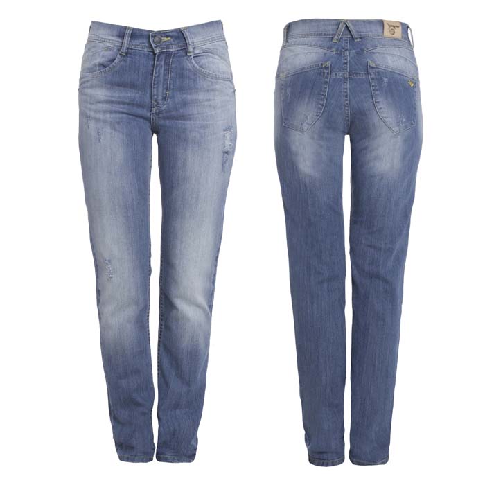 Джинсы для девочки синего цвета. На передних половинках боковые карманы и часовой. На задних половинках кокетки и два накладных кармана. На заднем правом кармане вышивка