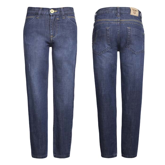 Джинсы для мальчика синего цвета. На передних половинках боковые карманы и часовой. На задних половинках кокетки и два накладных кармана.
