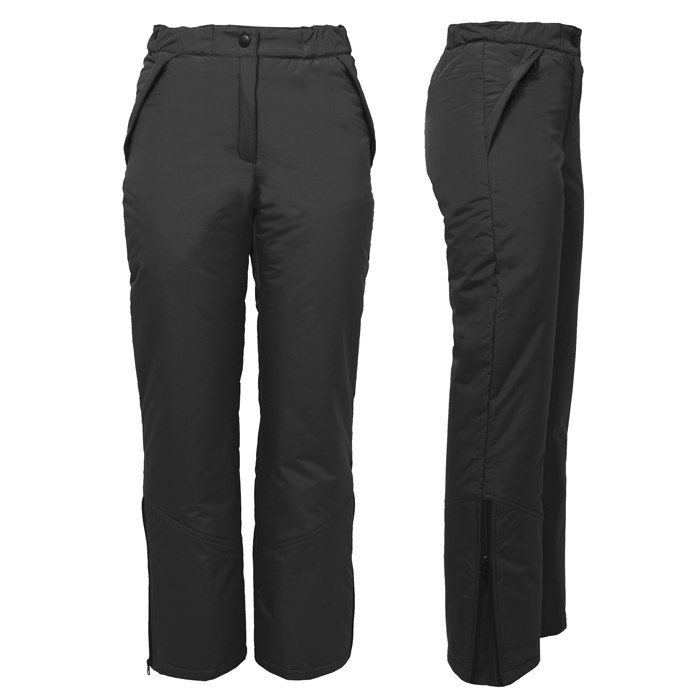 Брюки для девочки из курточного текстиля с водоотталкивающей пропиткой, чёрного цвета, на подкладке. Утеплённые на холофайбере плотностью 100г/2. Прямого силуэта. На передних половинках боковые карманы на молнии. На задней половинке кокетки. По низу боковых швов застёжка молния. По низу брюк пришита дополнительная деталь с резинкой для ботинок.