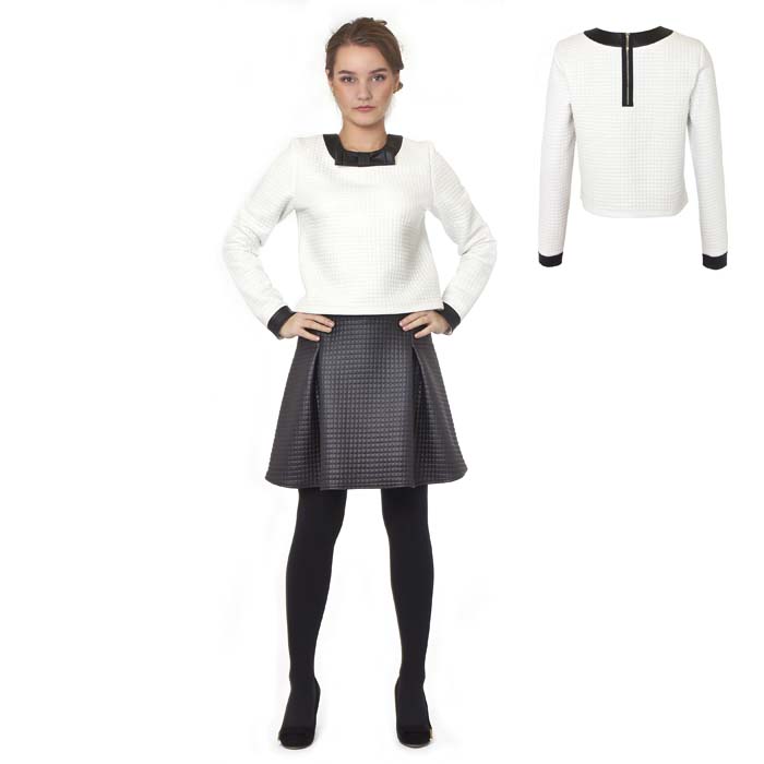 Джемпер для девочки из трикотажного материала с выработкой под кожу, белого цвета. Силуэт прямой. Длина ниже линии талии на 3-4см. Горловина, притачные манжеты, планки спинки из исскуственной кожи чёрного цвета. На спинке застёжка молния.