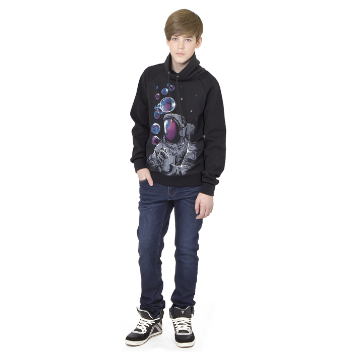 Толстовка для мальчика из утеплённого трикотажного футора чёрного цвета. Силуэт прямой. Длина стандартная. В высокий воротник продет шнур. Принт на полочке выполнен экокрасками. Притачной пояс и манжеты из отделочного материала контрастного цвета